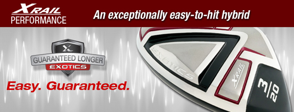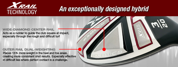 Tour Edge Exotics XRail Hybrid The message is clear and unmistakable: power, accuracy, and forgiveness. These are the attributes of one of the best performing hybrids in golf, the Xrail. Easy-to-hit, the Xrail’s sole features two outer rails and one wider inner rail that help players hit perfect shots from any lie. The new Xrail places 15% more weight in the larger outer rails to producing a higher moment of inertia for enhanced stability on off-center hits. The new wider, diamond-shaped inner rail guides the clubface into a square position at impact. The V-sole design also minimizes divots from heavy lies so shots get up and away quickly and easily. Exotics products have a rich heritage of craftsmanship. The Xrail is no different. Incorporating multi-metal construction, the Xrail combines a hyper-steel body with a thinner Carpenter steel face. The thinner face along with variable face thickness allows for exceptional feel, proven forgiveness and added power, even on off-center hits.