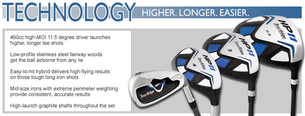 Tour Edge HP-11 Complete Set - Senior Affordable, high-performance technology in a complete graphite set for seniors. The oversized 460cc titanium matrix driver features 11.5 degrees of loft and a high-MOI design compliments of the Power V sole. The sole in the driver, fairway woods and hybrids features five weight pads that move weight back and away from the face to deliver high flying, accurate shots. The driver’s ultra-thin face improves forgiveness on off-center hits and provides a quick launch off the face. Plus, the oversized, low-profile stainless steel fairway woods are easy to hit and get the ball quickly into the air from any lie on the course. Eliminating hard-to-hit long irons, the HP11’s forgiving hybrid features a stainless steel head with a low-profile design that makes hitting great shots easy. The mid-sized stainless steel, cavity back irons feature heel and toe weighting and an undercut cavity for a larger sweet spot and deadly accurate iron performance. The set’s mallet-style putter features a popular white finish and easy-to-use alignment aid for accurate set up and a smooth stroke that keeps putts on line.