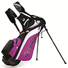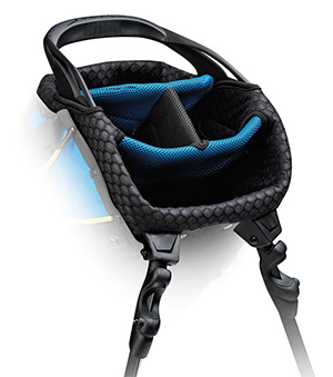 The Tourlite stand bag is only 3.9 lbs, yet has a 4-way top with handle (8.5"x7.5") and 2 full length dividers. A 4 pt. shoulder strap with air mesh, anti-split stand system, and an EVA ergonomically molded hip pad make it great for carrying on the course. The Tourlite also includes a velcro glove tab, pen sleeve, umbrella sleeve, single strap attachment and rain hood.