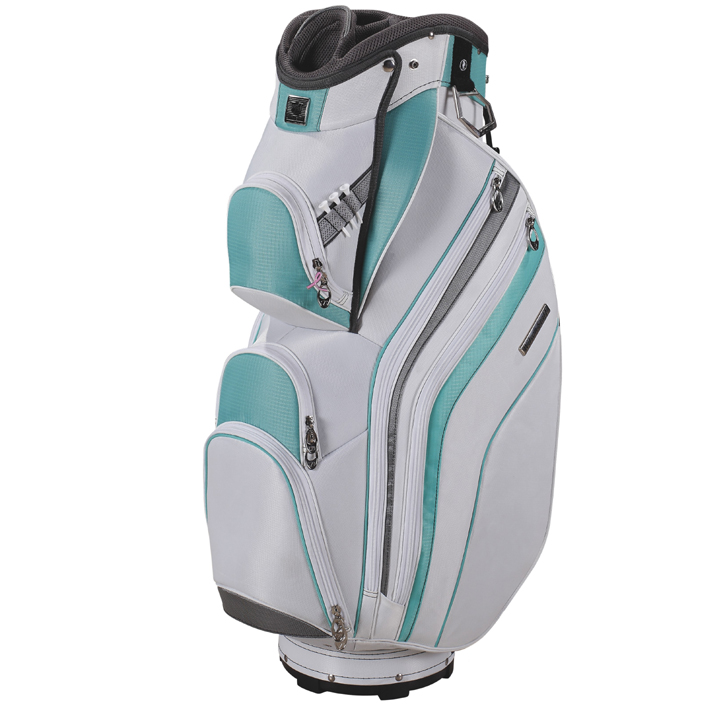 Wilson Staff Ionix Cart Bag - WomensThe Women's Ionix Cart bag caters to the lady golfer preferring a trolley or pull cart. Providing plenty of storage space for accessories and valuables, the bag also features a large insulated pocket for cooling your on-course beverage. The unique trolley base has a groove to lock in the bottom bracket of the trolley, and side lift handles provide for convenient lifting on and off the trolley or cart. The sleek mint and white color scheme perfectly complements the style of the D-100 family of products.