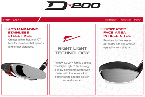 The Wilson Staff D200 fairway woods – designed for the Distance player needing power, accuracy and a confidence-inspiring look at address – features a premium Carpenter Custom 455 maraging steel face insert which maximizes distance from the tee, fairway or rough. PREMIUM FACE INSERTThe premium Carpenter Custom 455 maraging stainless steel face insert creates a thin, hot, high CT face for increased ball speeds and longer distances. OPTIMIZED FACE AND CLUB HEAD DESIGNAn increase in face area, especially in the heel and toe areas, promotes forgiveness and improved ball speeds on off-center hits. Rounded sole designs yield versatility from all playing conditions. RIGHT LIGHT TECHNOLOGYThe Right Light Technology, achieved through optimizing the distribution of the fairway wood's limited available mass with a thin variable face, allows golfers to swing even faster with the same effort.